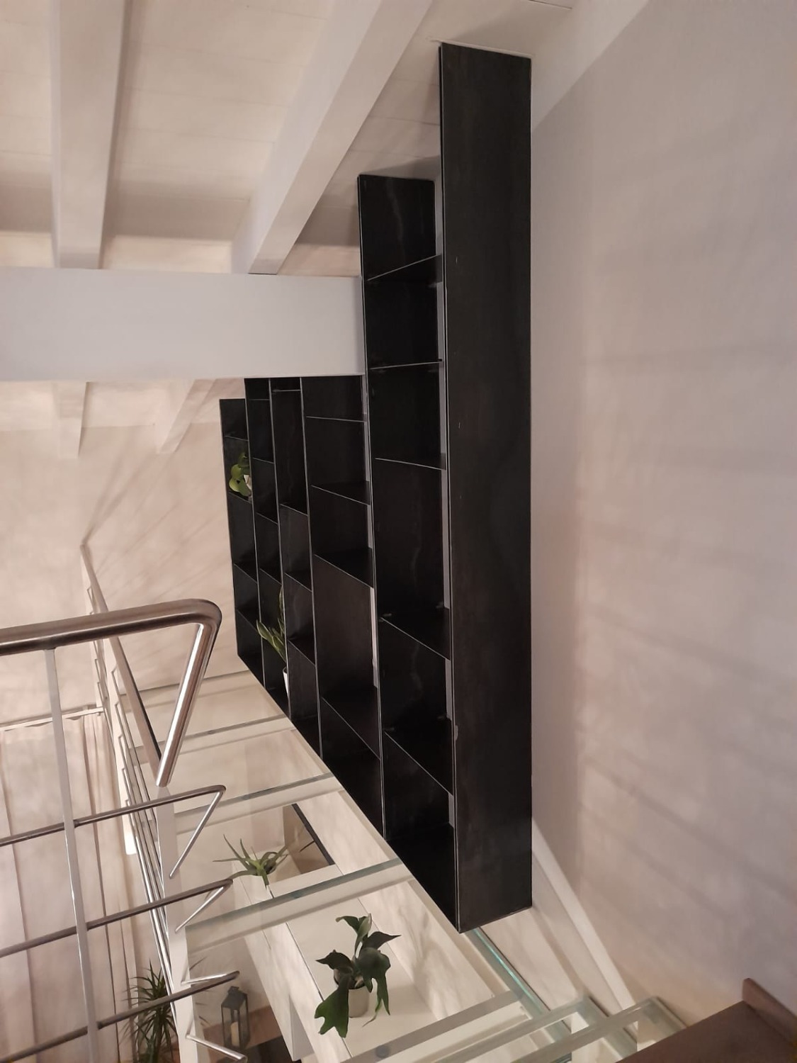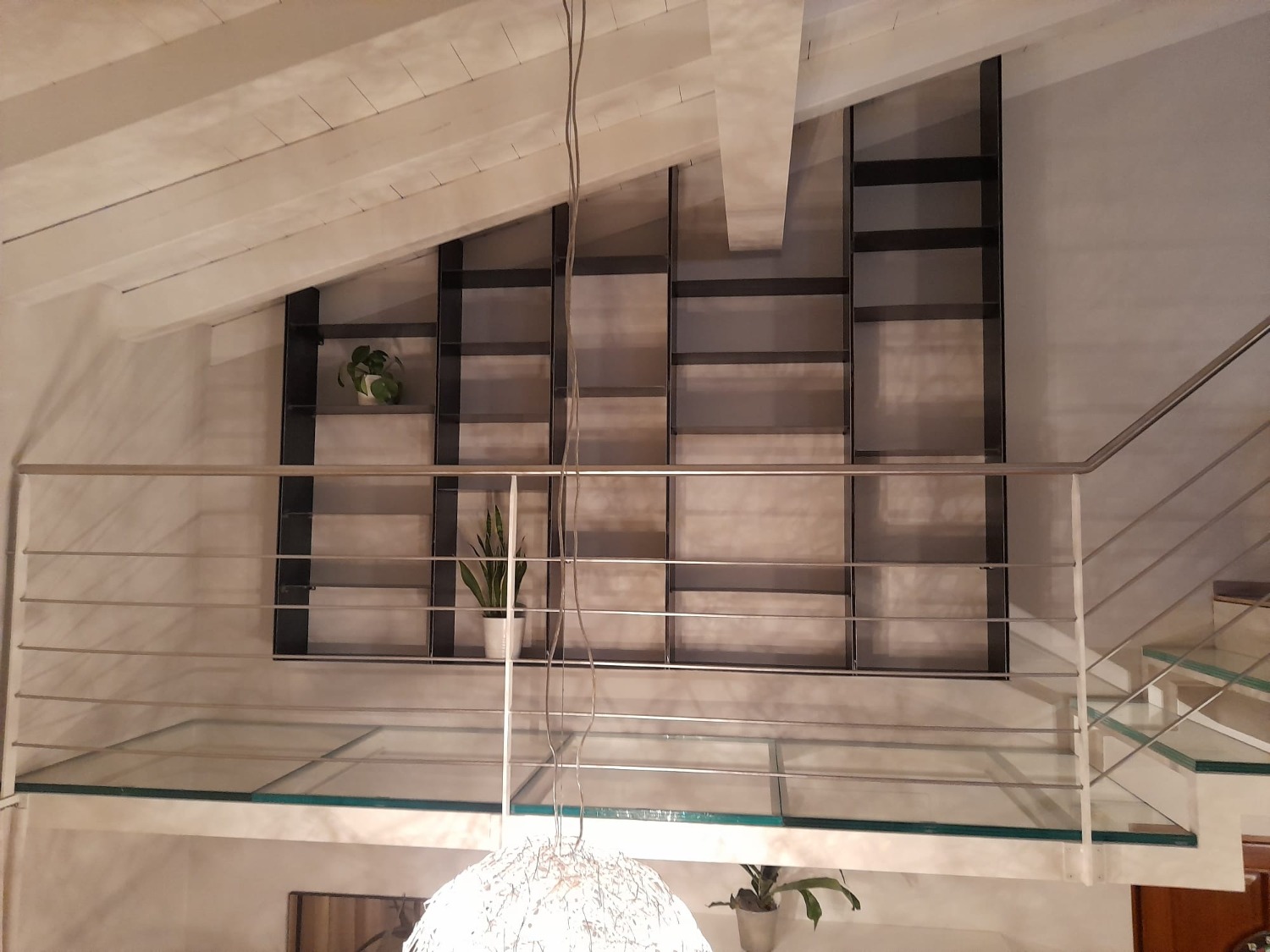 Realizzazione passerella in vetro e ferro verniciato e libreria in ferro grezzo cerato.